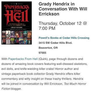 This is it everyone! Grady and I will meet for the first time face-to-face and discuss our book Paperbacks from Hell, out now from Quirk Books. Starts at 7:00pm at Powell's at Cedar Hills just outside Portland. We'll be talking about all those great vintage paperbacks you know and love and signing copies of ours. If you're in the area it'd be great to meet you!