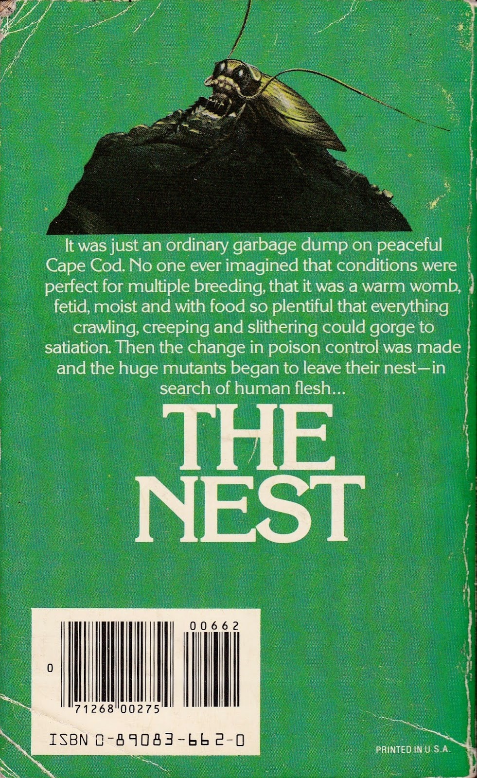 Yep--The Nest is powerhouse pulp horror, written with enthusiasm and tasteless know-how, a creepy-crawly scarefest that assaults the reader with one revolting sensation after another. If everyday roaches are disgusting, six-inch-long roaches with mandibles of chewing death are immeasurably more disgusting! A swarm of mutated cockroaches have somehow "organized" themselves by some unknowable miracle of evolution into a thinking organism, each individual creature a cell in the larger mass. Get used to that wave of shivers across your neck and shoulders, because this writer doesn't skimp on the gory details (like how the insects eat through the victim's eyes into the brain!). All-out over-the-top '80s schlock-horror doesn't get much better.