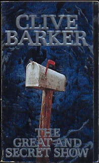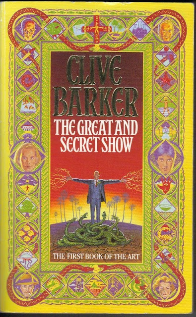 A British edition of the 1990 paperback of The Great and Secret Show, the first novel in Clive Barker's long-planned magnum opus trilogy called "The Art." It concerns, as Barker was fond of saying at the time, his three obsessions: "sex, Hollywood, and the end of the world," and features one of the more astonishing creations in his fiction: the vast "dream-sea" of Quiddity, which is pretty much a literalized Jungian collective unconscious. Heady stuff for a horror novel.