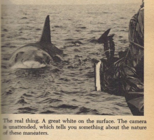 Also scattered throughout are misleading photos of Bruce the mechanical shark identified as a real great white - purportedly to confuse moviegoers. Guess I can't blame Gottlieb or whoever was involved with writing text for the photos; in 1975 people weren't quite as savvy about great white sharks as they are today, what with Air Jaws and Shark Week and now Expedition Great White. People are so shark-jaded these days.