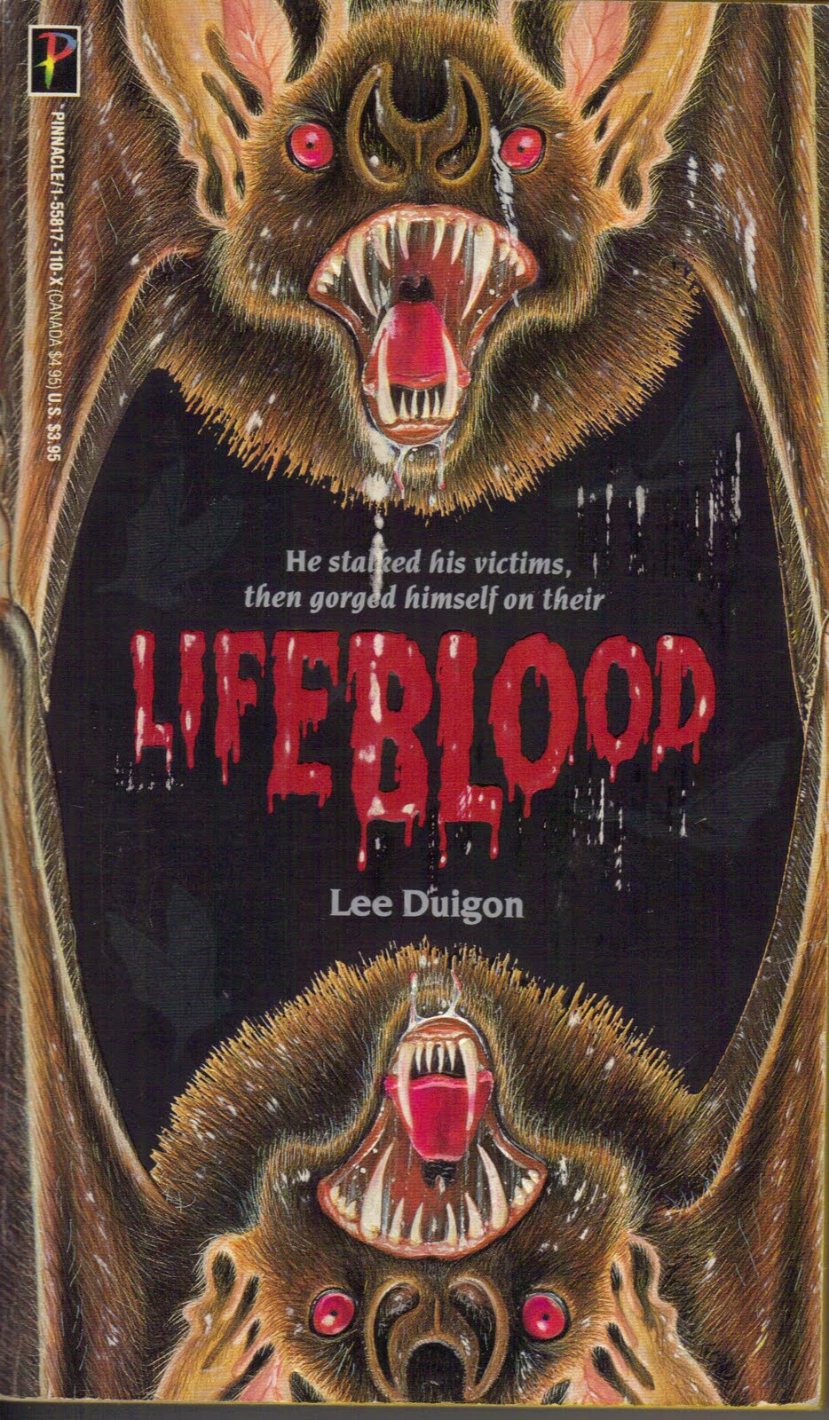 Leave it to a cheap-looking '80s horror paperback from Pinnacle Books to feature ridiculous cover art of a demonically leering rabid vampire bat ready to attack… in a vampire novel that denies that vampires can turn into bats. Repeatedly and without doubt. Of course, this tacky cover was the only reason I even bought Lifeblood, a book I’d never ever heard of before, nor did I have any familiarity at all with author Lee Duigon. So it might please you to know it’s not nearly as cheap or tawdry as its cover would lead you to believe; while Lifeblood is clearly no lost classic, it’s a fairly readable 'Salem’s Lot-lite that doesn’t try to be ambitious, nor does it insult readers’ intelligence with unbelievable coincidences or poor hack writing. Well, it might have some hack writing but nothing that’s gonna make you want to toss the book in a corner, cursing at its stupidity… like some horror I’ve read.